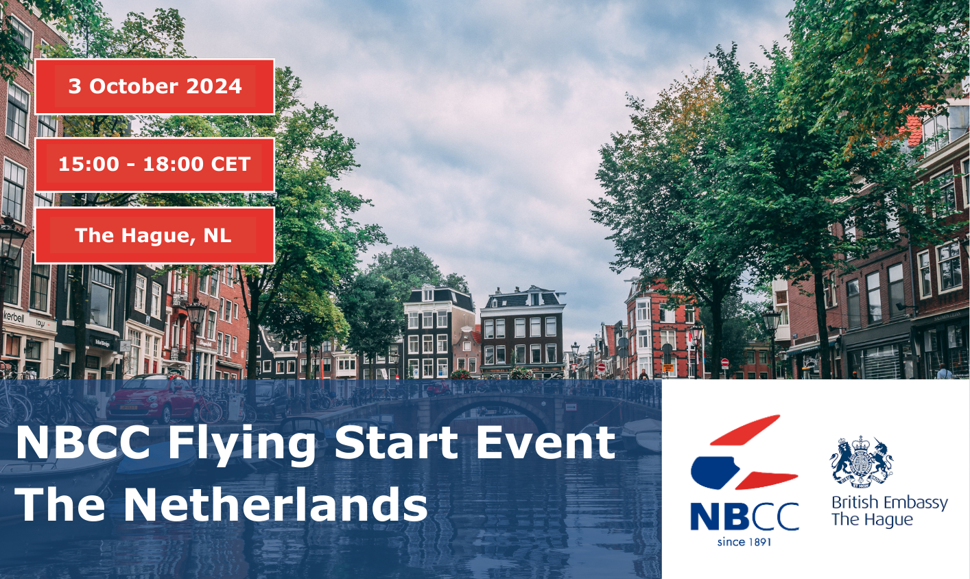 We are delighted to invite you to the NBCC Flying Start Event, hosted in partnership with the British Embassy in The Hague, on Thursday, 3rd October 2024 from 15:00-18:00 CET at the British Ambassador's Residence.